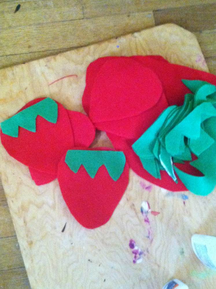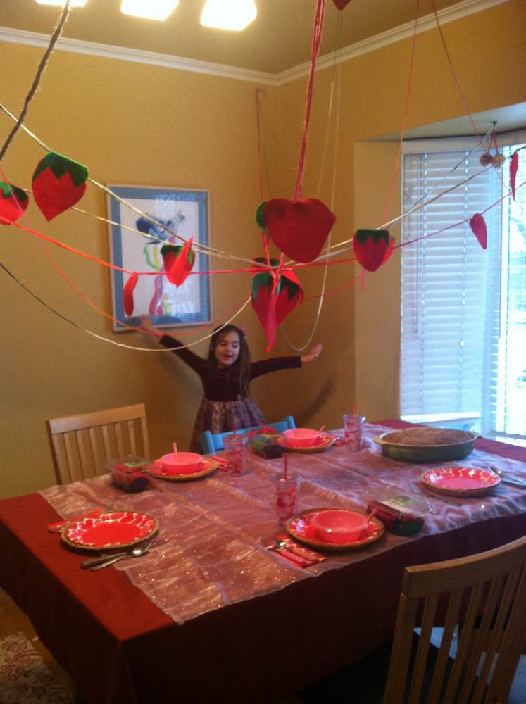 The idea of a surprise party for Allegra began to take shape and Mina was crazy excited to plan it! Miss Allegra loves strawberries, so we decided to do a Strawberry Surprise Party! After our brainstorming session, it was decided: a Strawberry Menu and decorate the dining room like a Strawberry Patch. We had about 4 hrs to plan, prepare, and set up! Mina loves to do special things for people, most Especially Allegra. I wanted her to be as part of the creative process as possible, so I asked her what a strawberry patch would look like and she suggested strawberries dangling from the ceiling made from felt, not paper. She was in charge of creating the garland while I prepared the food.